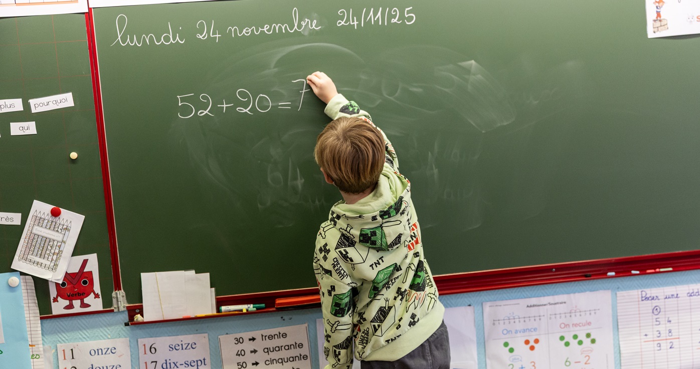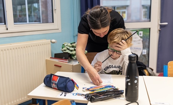 Arthur, sept ans, lunettes vertes et tee-shirt dinosaure, est attablé à son bureau dans sa classe de CE1 de l’école Paul Cézanne, à Marines (95). Comme tous ses camarades, il travaille dans le calme sur les exercices proposés par son enseignante. À côté de lui, son AESH (accompagnant d'élèves en situation de handicap) l’épaule comme chaque jour.